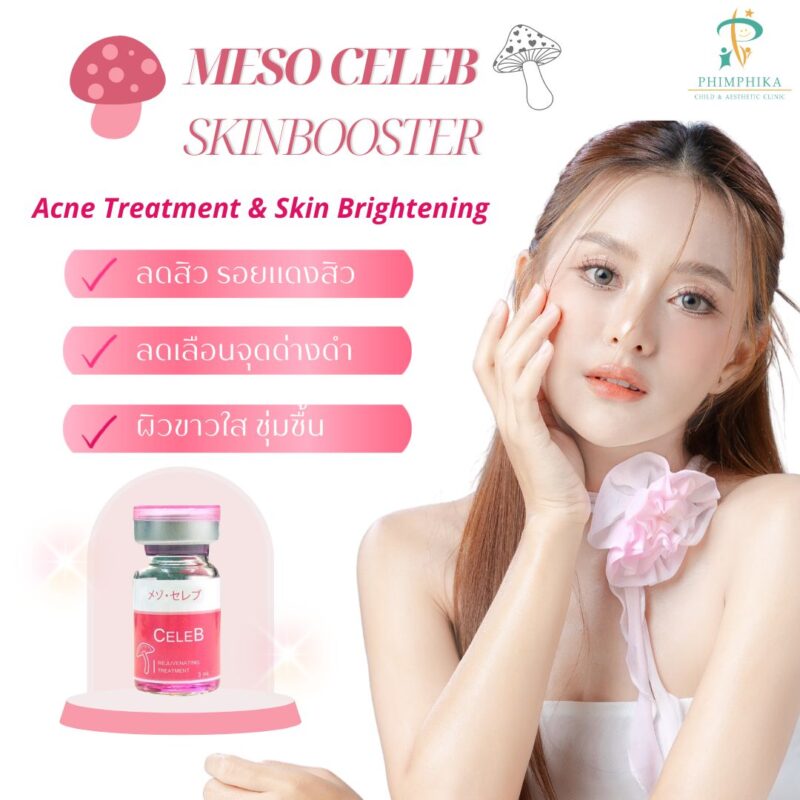 Meso Celeb is mesotherapy for acne treatment and skin brightening. It consists of DNA from Reishi Mushroom from Japan, which helps detoxify, reduce inflammation and black spots from acne. It also contains multivitamins and amino acids, antioxidants that help enhance collagen production, reduce inflammation, and renew skin cells. Additionally, it includes hyaluronic acid for moisturizing the skin and reducing wrinkles.