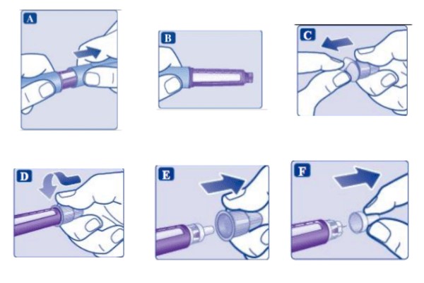 - ก่อนฉีดทุกครั้งควรดูชื่อและสีฉลากบนปากกาว่าถูกต้องไหม แล้วค่อยๆ ดึงปลอกปากกาออก
